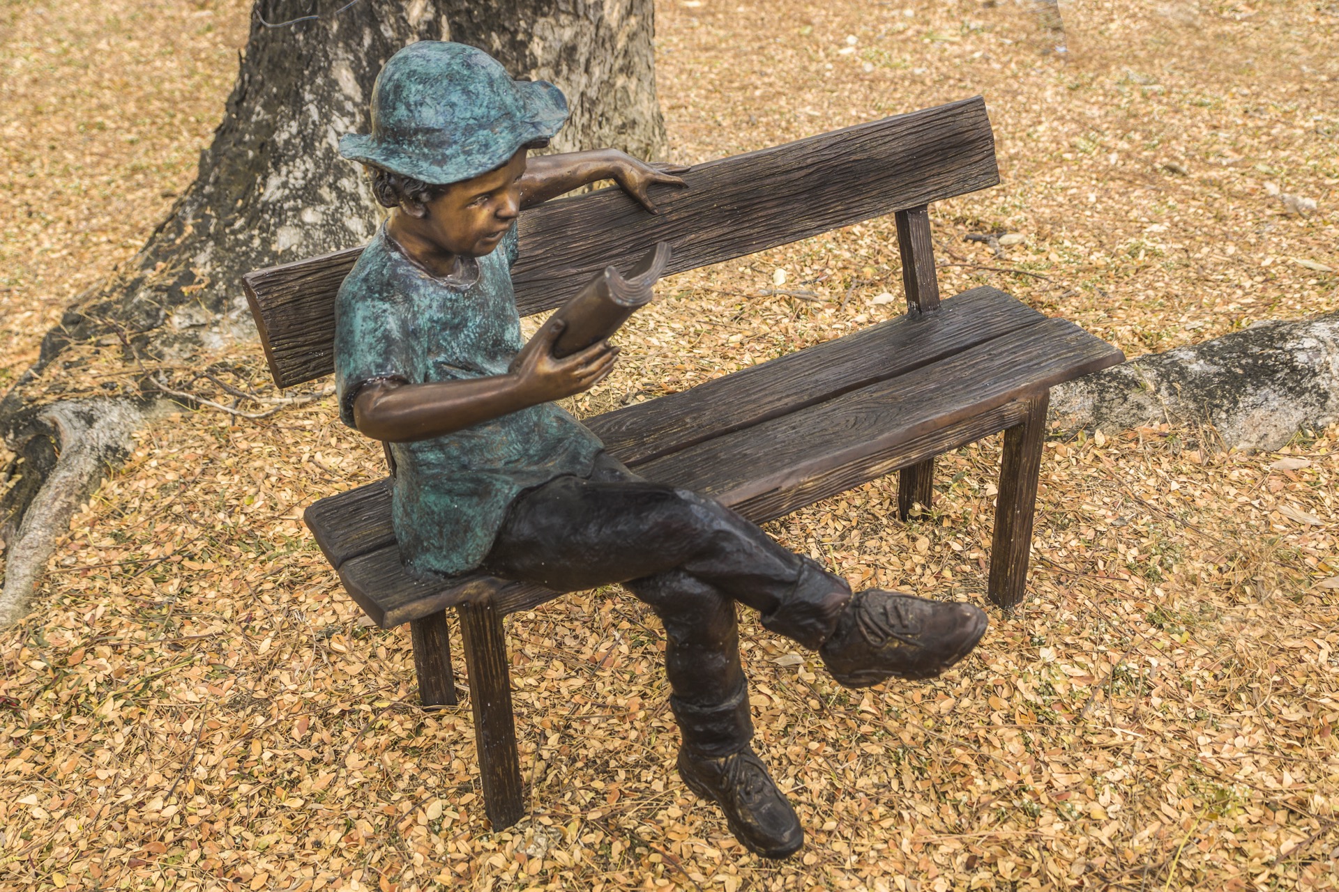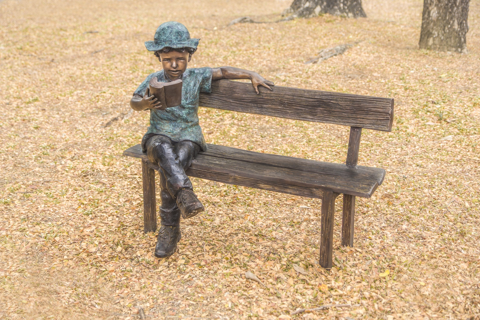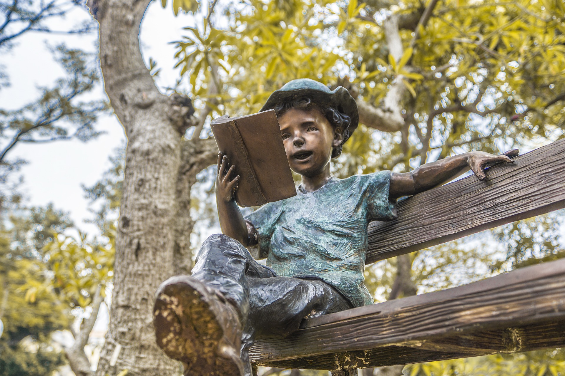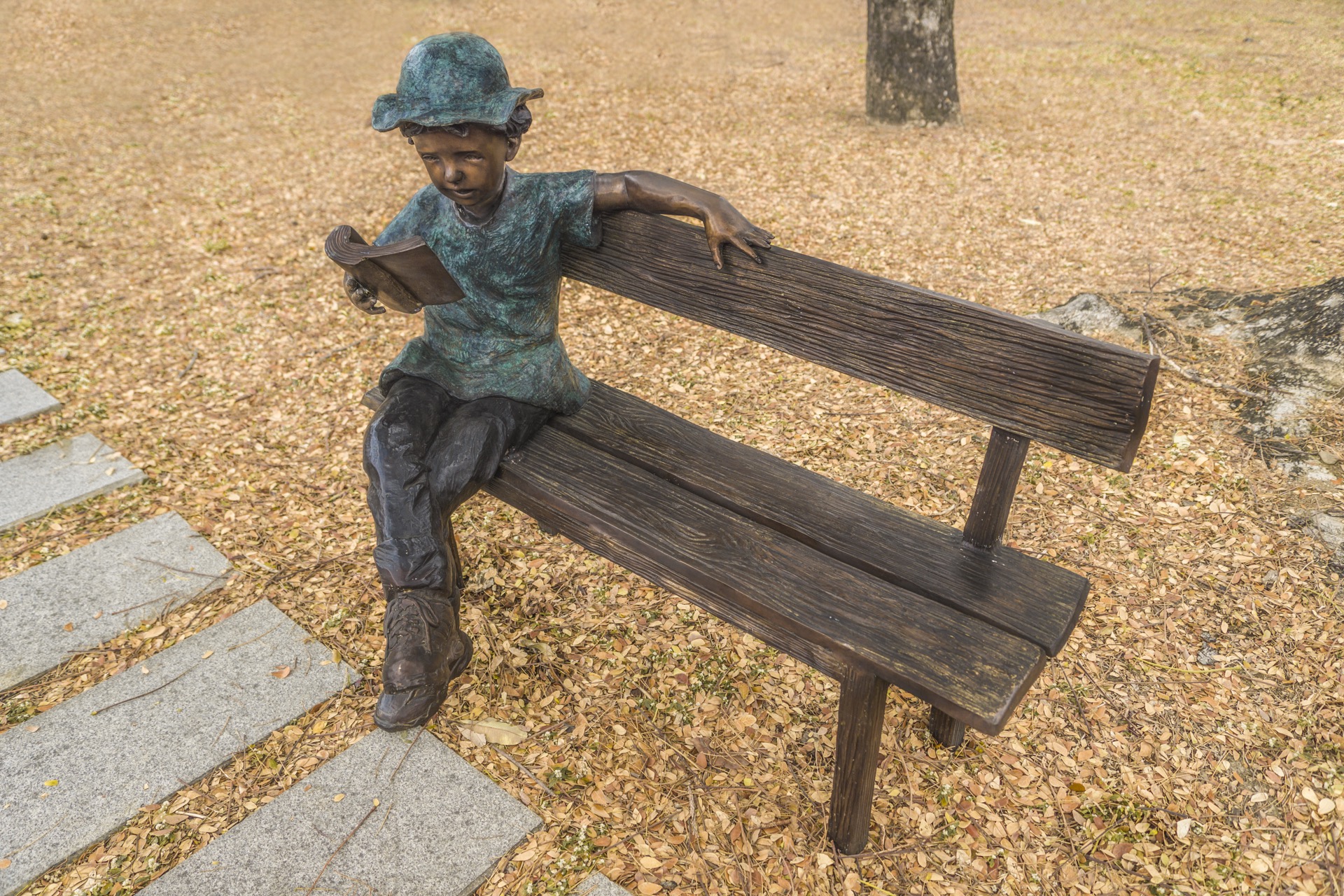 作品中的小男孩穿著輕鬆率性,頭戴休閒帽遮擋煦煦的陽光,沈浸在書籍的世界裡,乘著想像的翅膀,隨意穿梭在由文字構築而成的奇異空間…