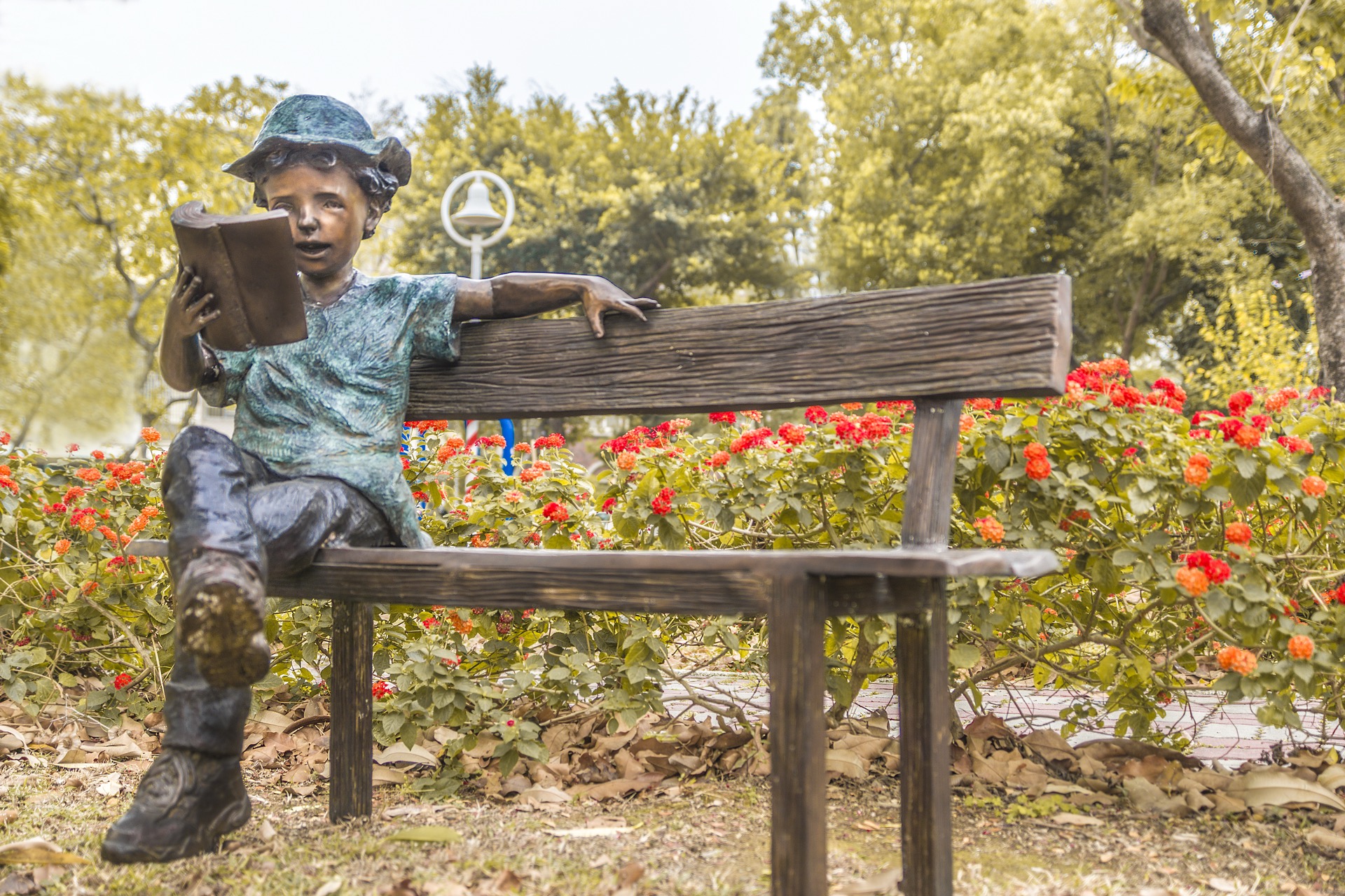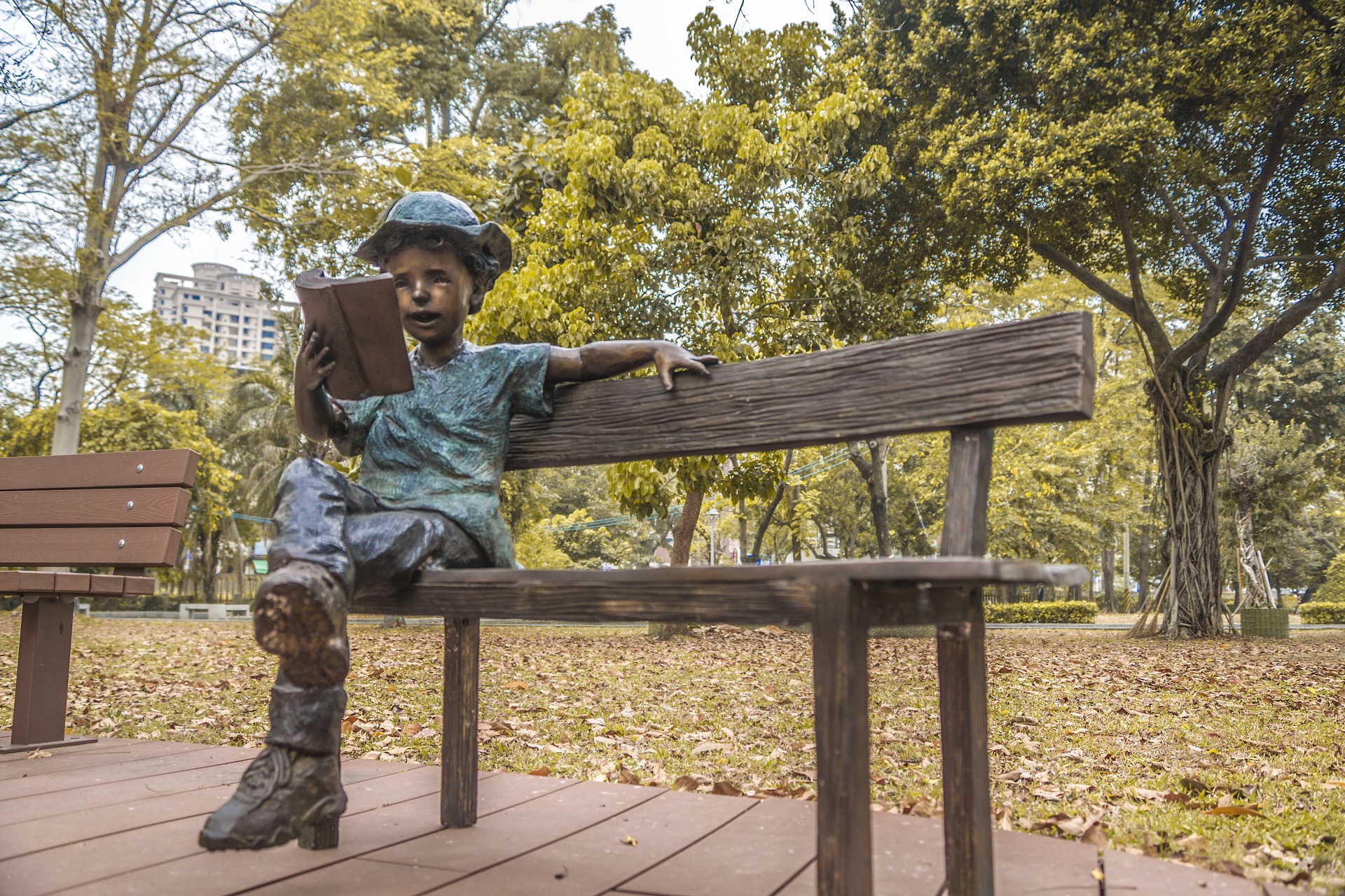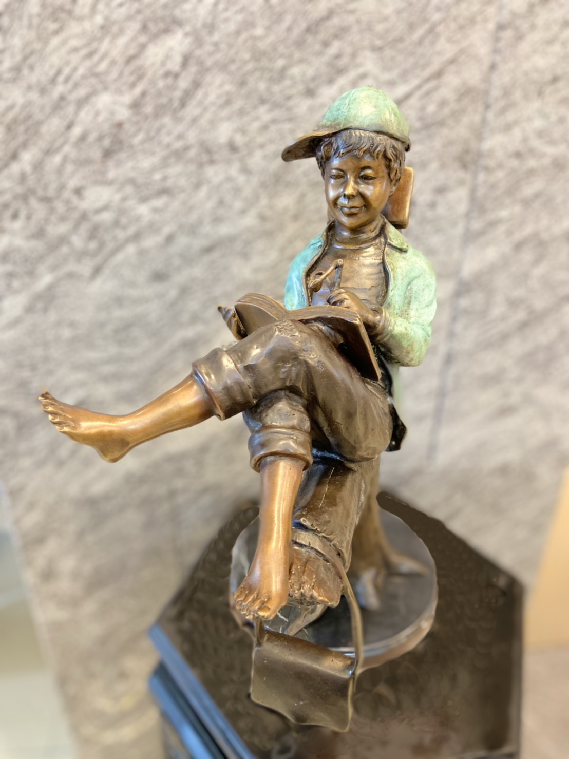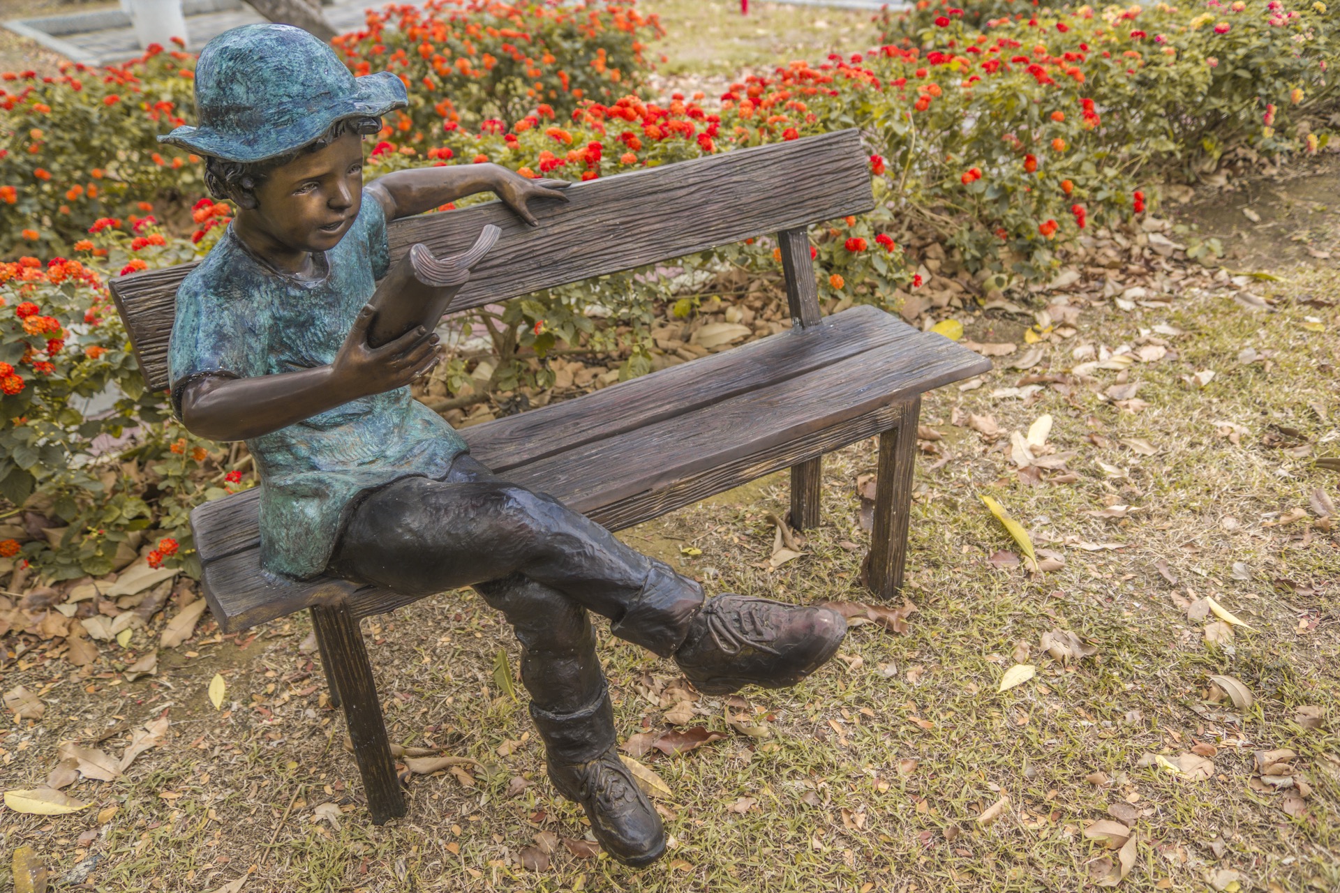 作品中的小男孩穿著輕鬆率性,頭戴休閒帽遮擋煦煦的陽光,沈浸在書籍的世界裡,乘著想像的翅膀,隨意穿梭在由文字構築而成的奇異空間…
