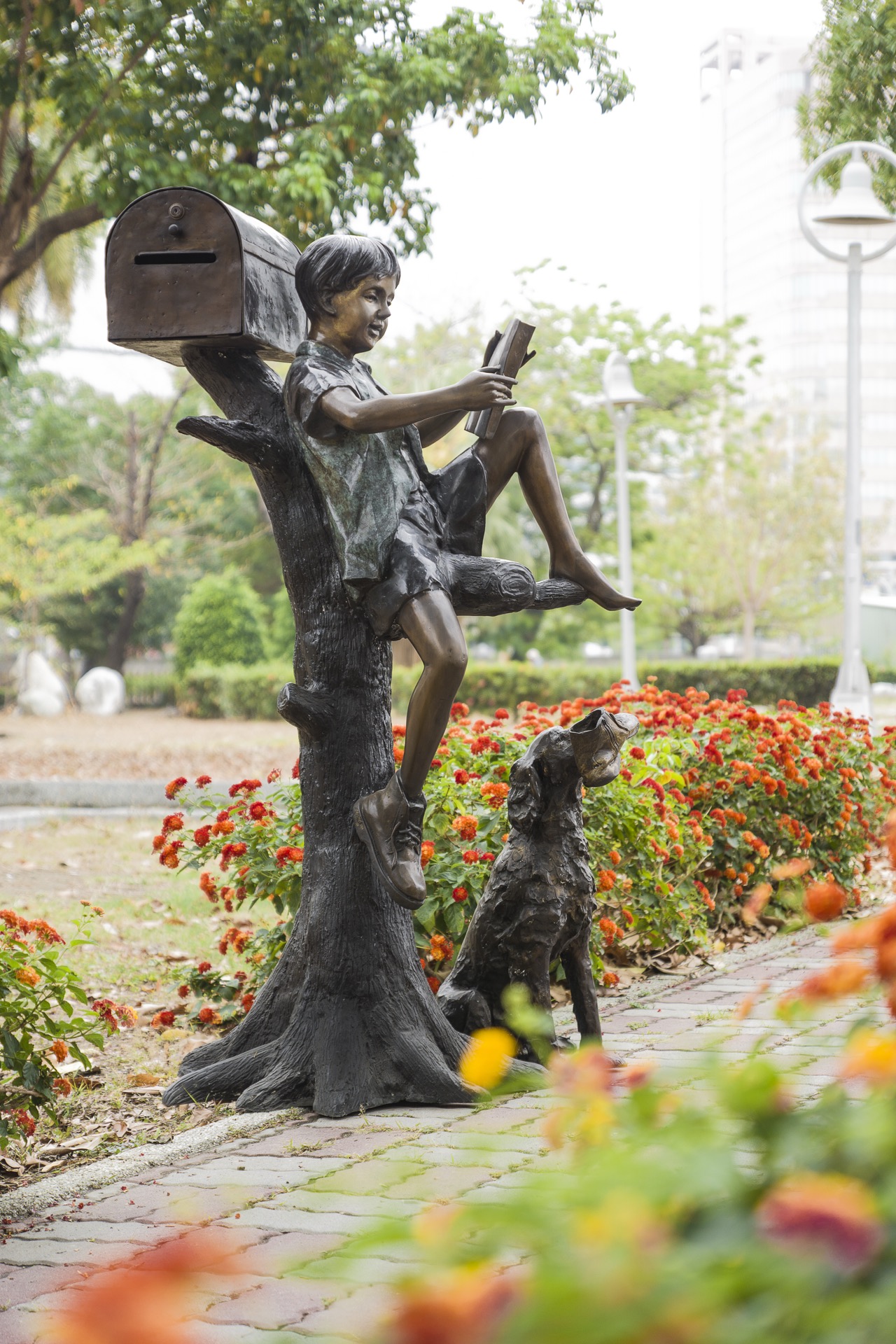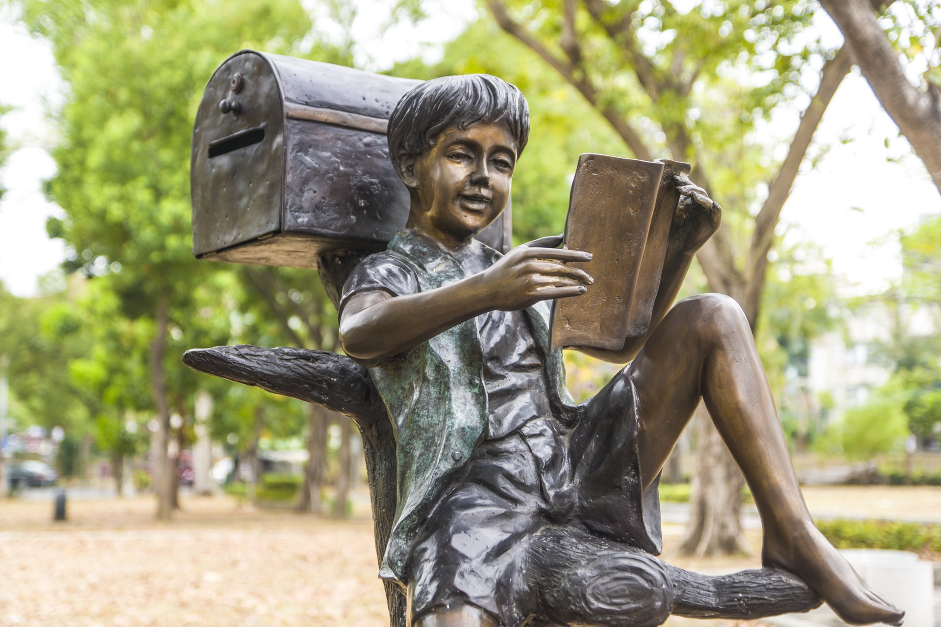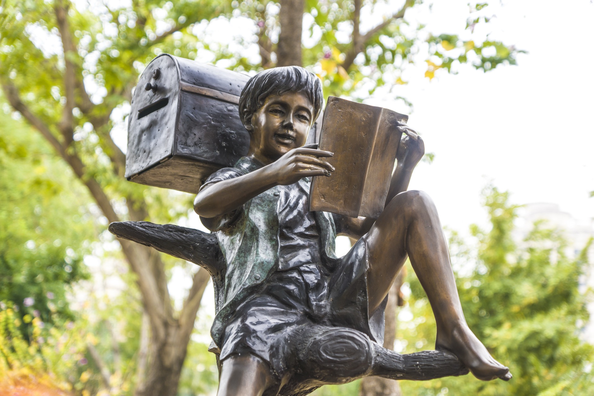 樹上看書男孩、小狗與信箱
