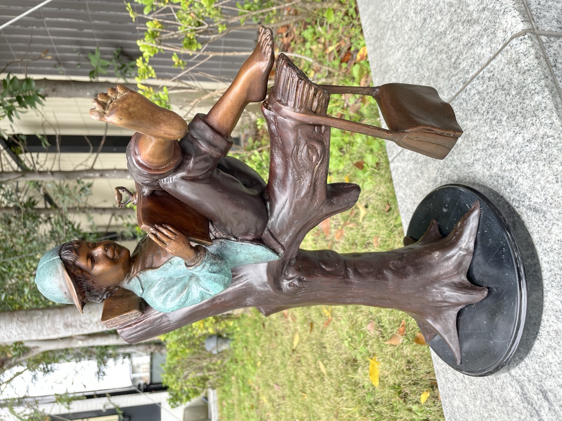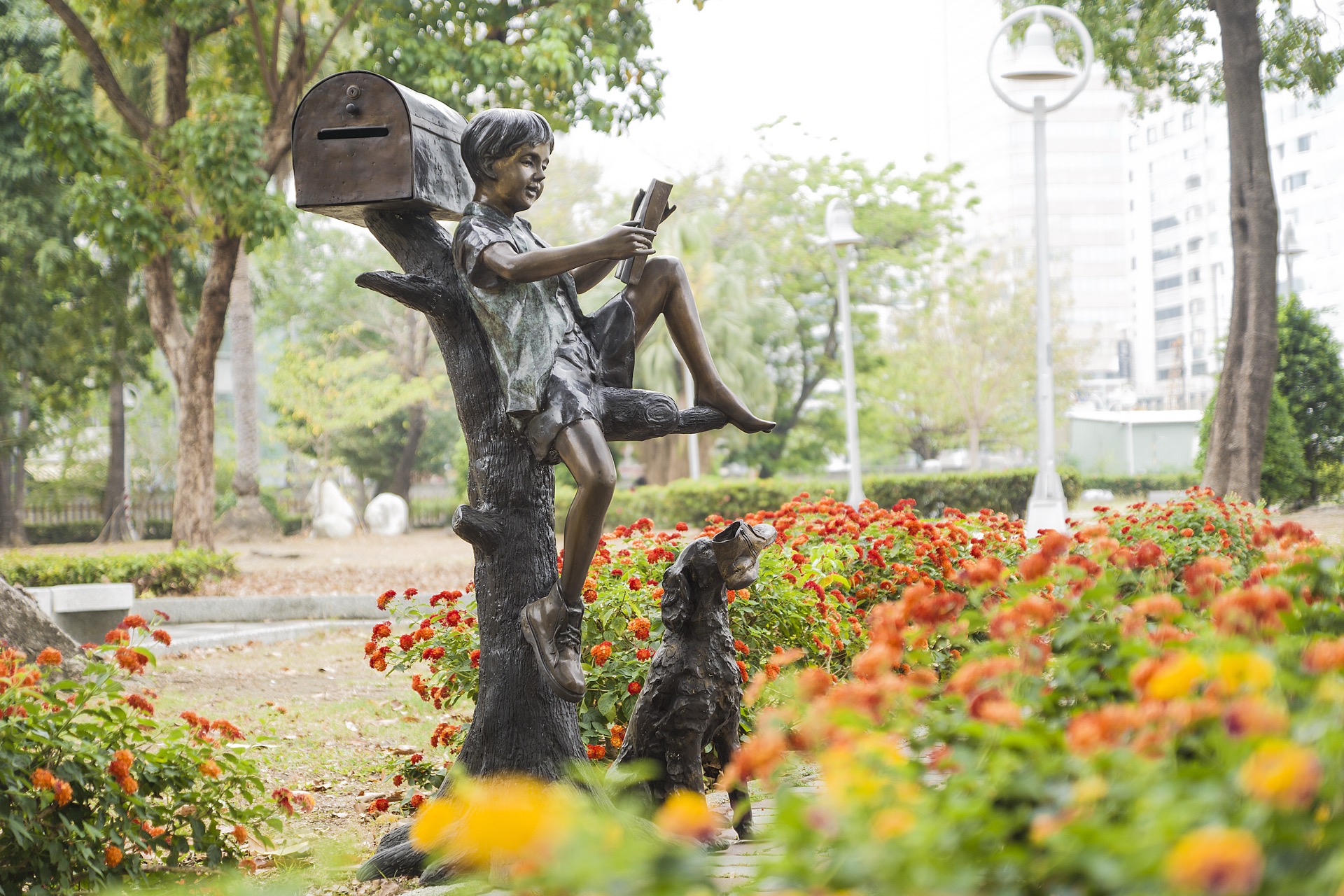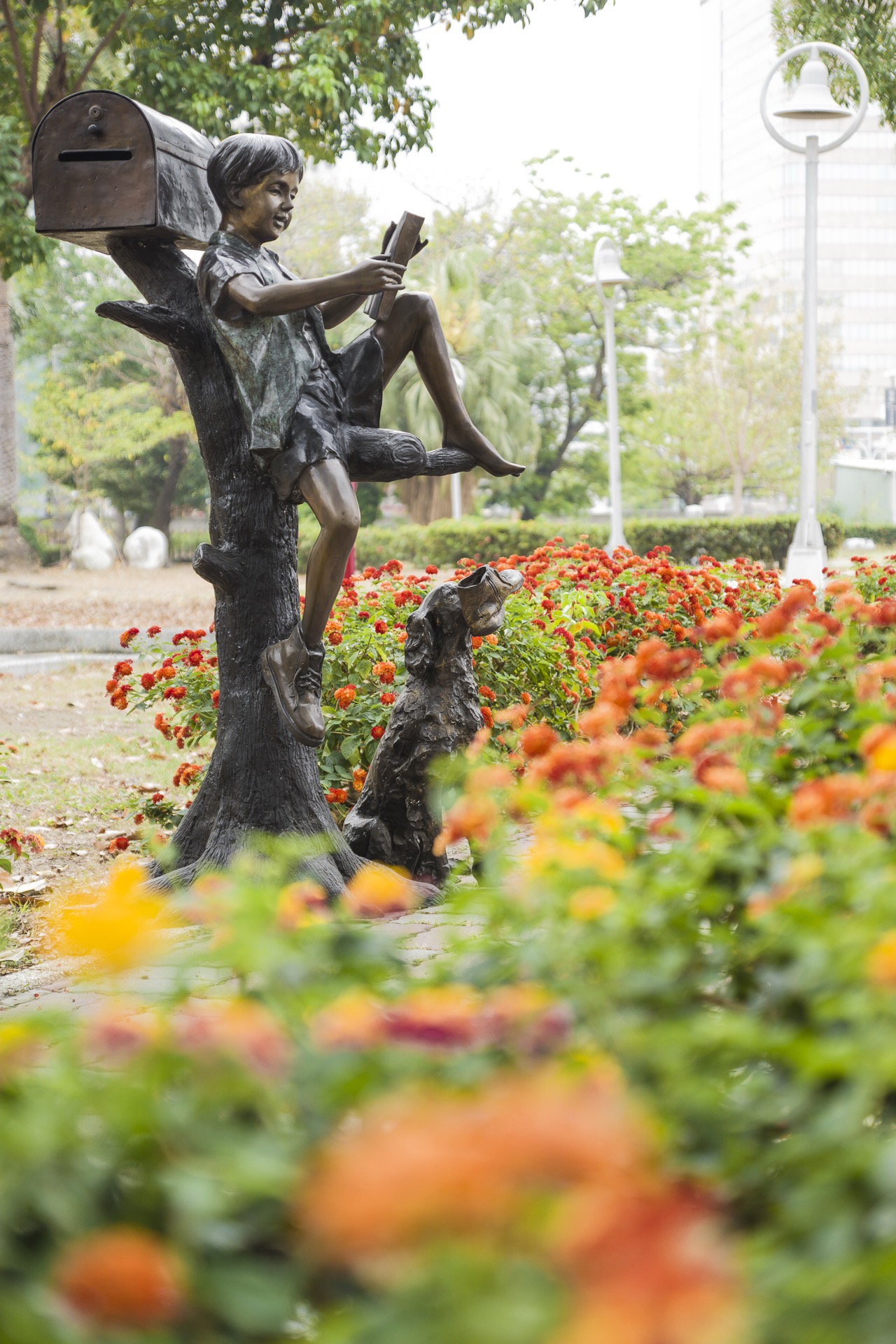 樹上看書男孩、小狗與信箱