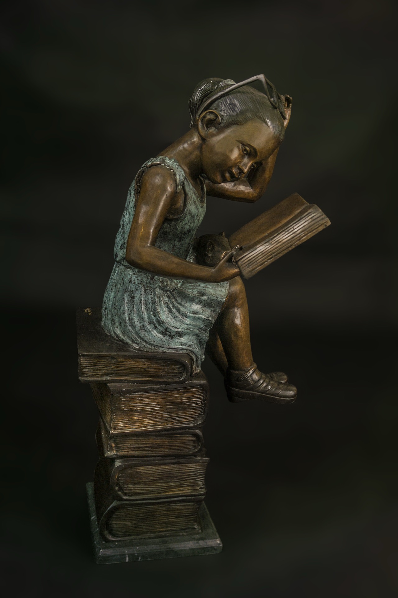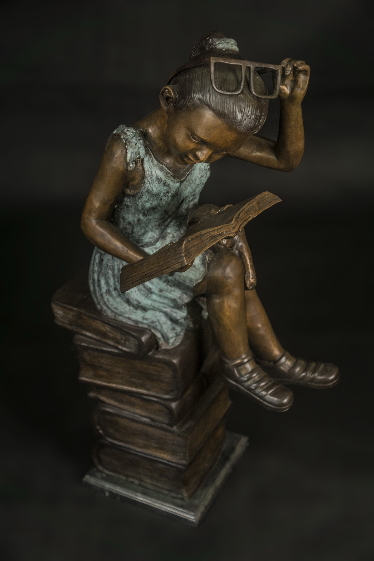 閱讀—有若開啟一扇通往世界之窗。 少女把細細挑選的書籍,一本本堆疊,隨興端坐在高度與自己身高差不多的書堆上,迫不及待地翻開書頁,沉浸在文字堆砌的書香世界中。嘿!似乎在書中看到了什麼新鮮處,且提起眼鏡來看個仔細吧…
